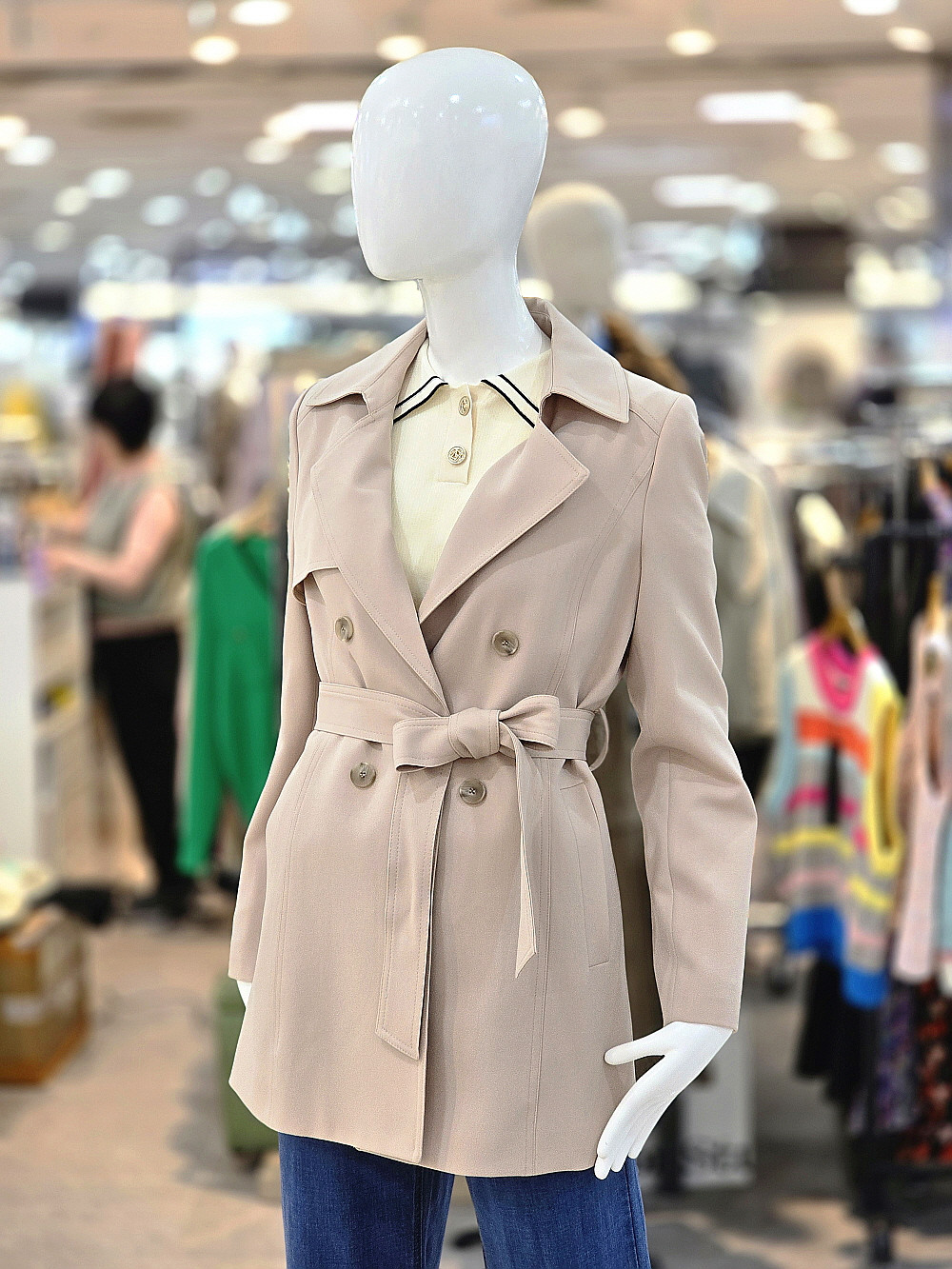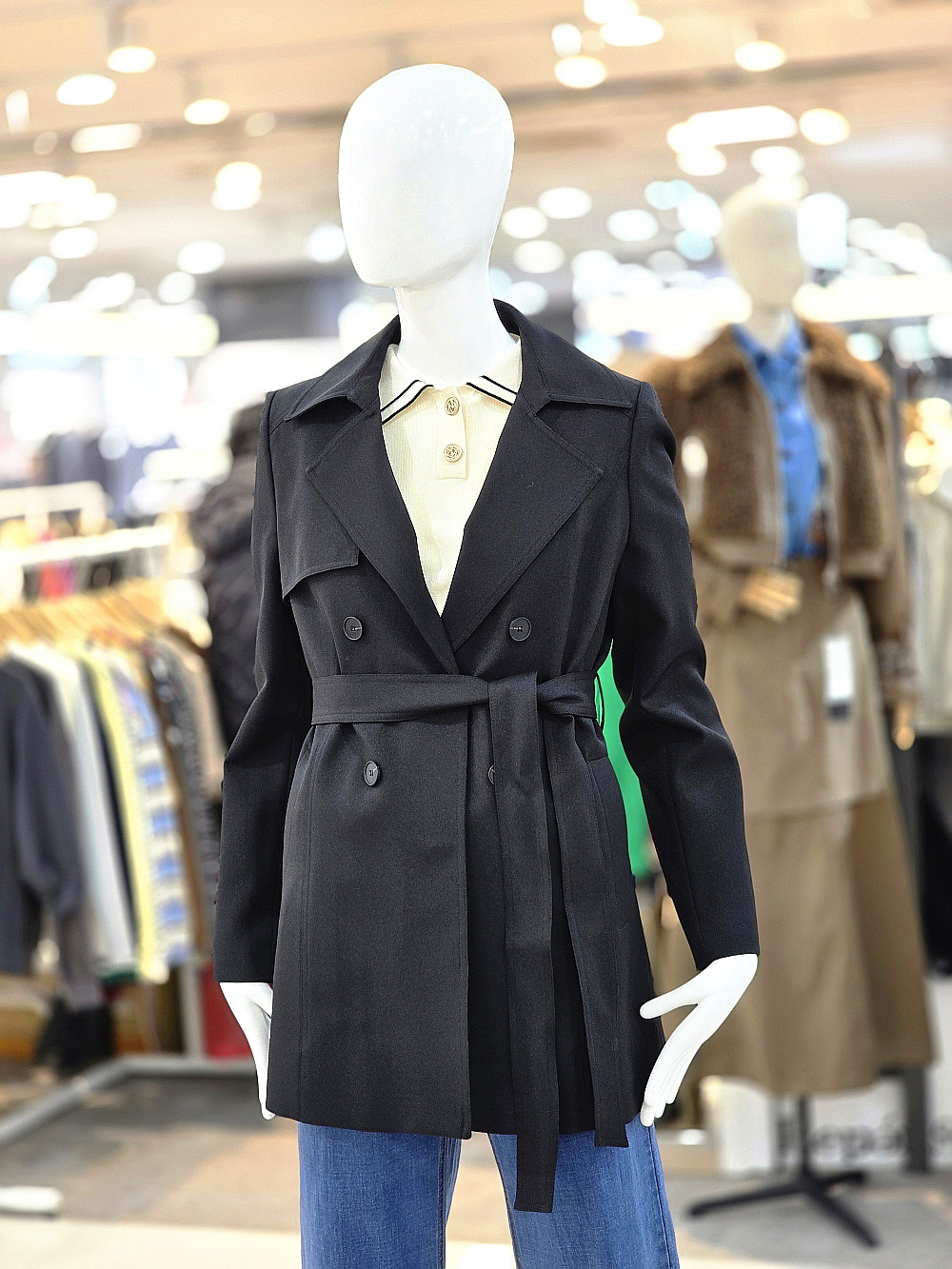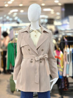 더블 버튼 디테일과 허리 벨트가 조화를 이루어 슬림한 실루엣을 연출하며,