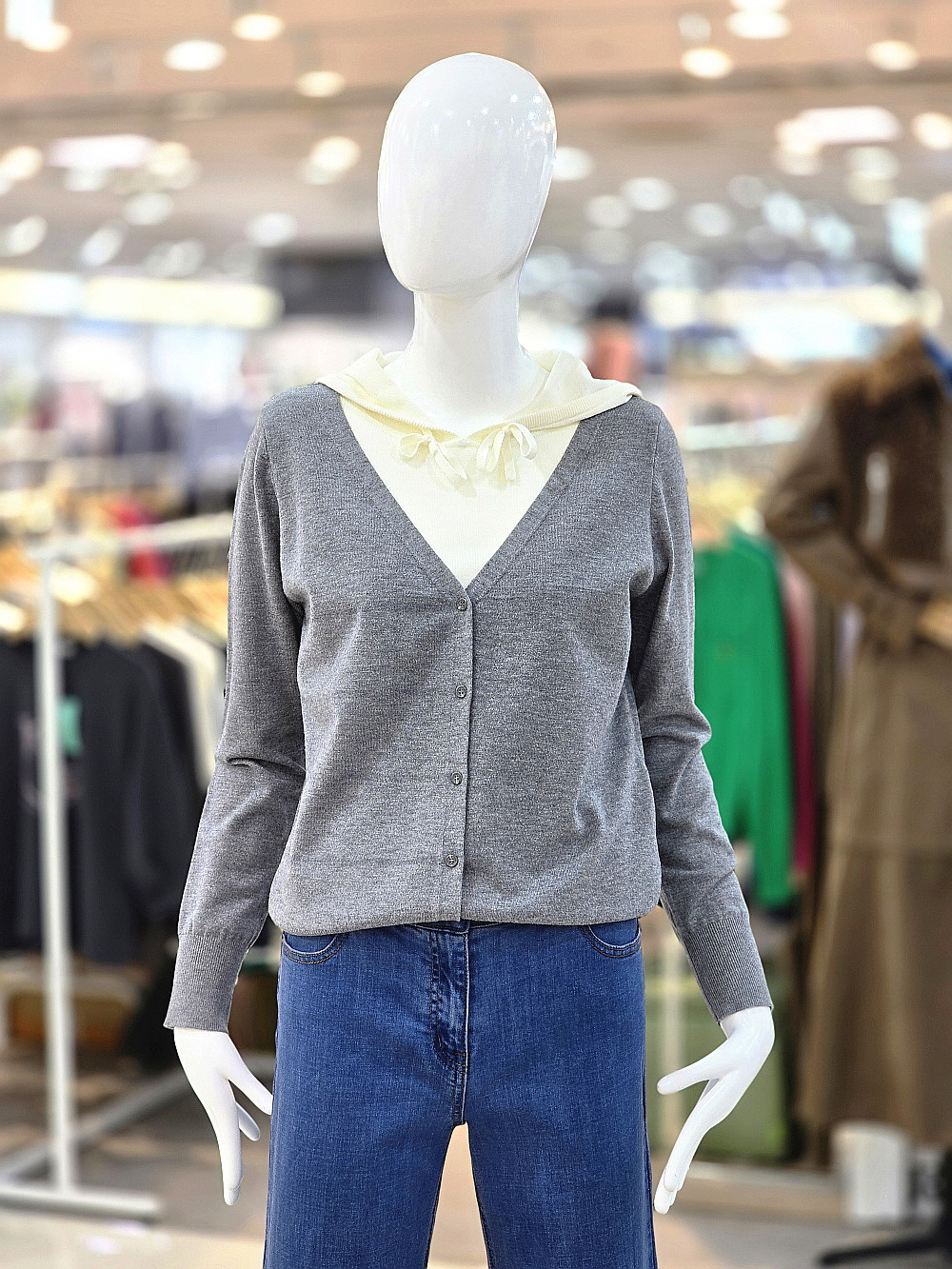 브이넥 버튼 스타일로 단정하면서도 편안한 분위기를 연출하며 다양한 이너와 자연스럽게 매치됩니다.
