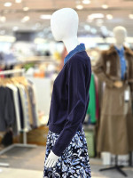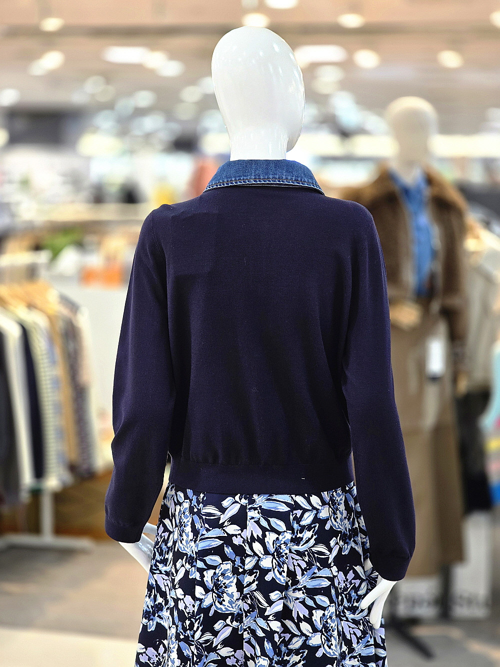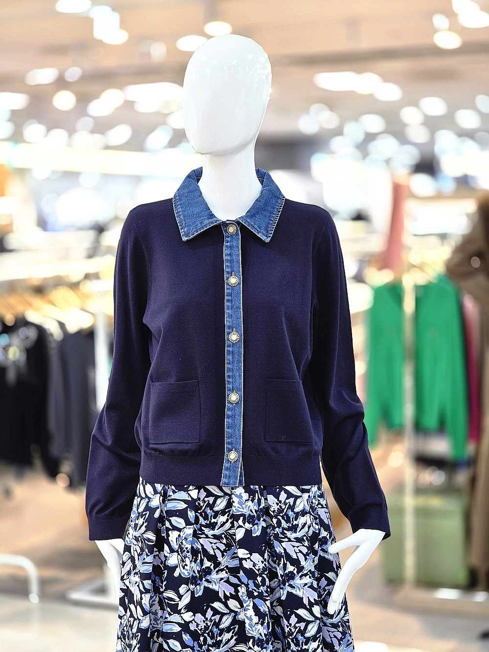 데님 배색 카라 디테일이 포인트가 되는 꼼빠니아 니트 가디건입니다.