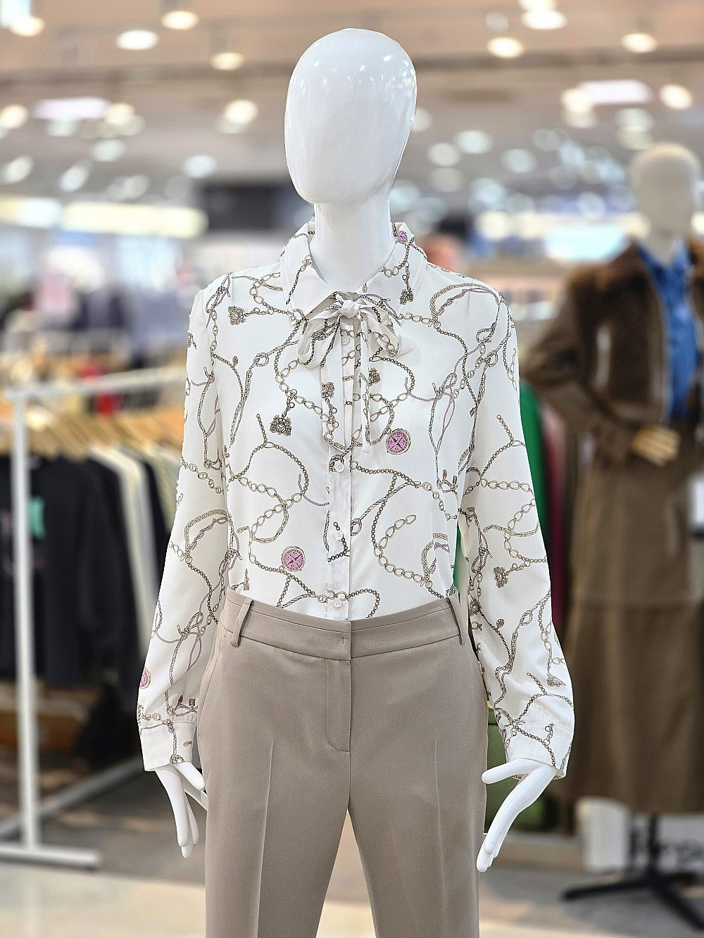 우아한 체인 패턴과 타이 디테일이 돋보이는 꼼빠니아 블라우스입니다.