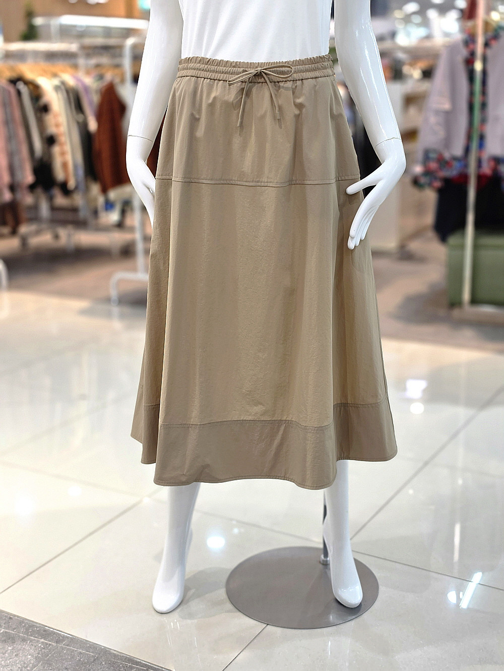 편안한 착용감과 자연스러운 실루엣이 매력적인 밴딩 미디 스커트입니다.