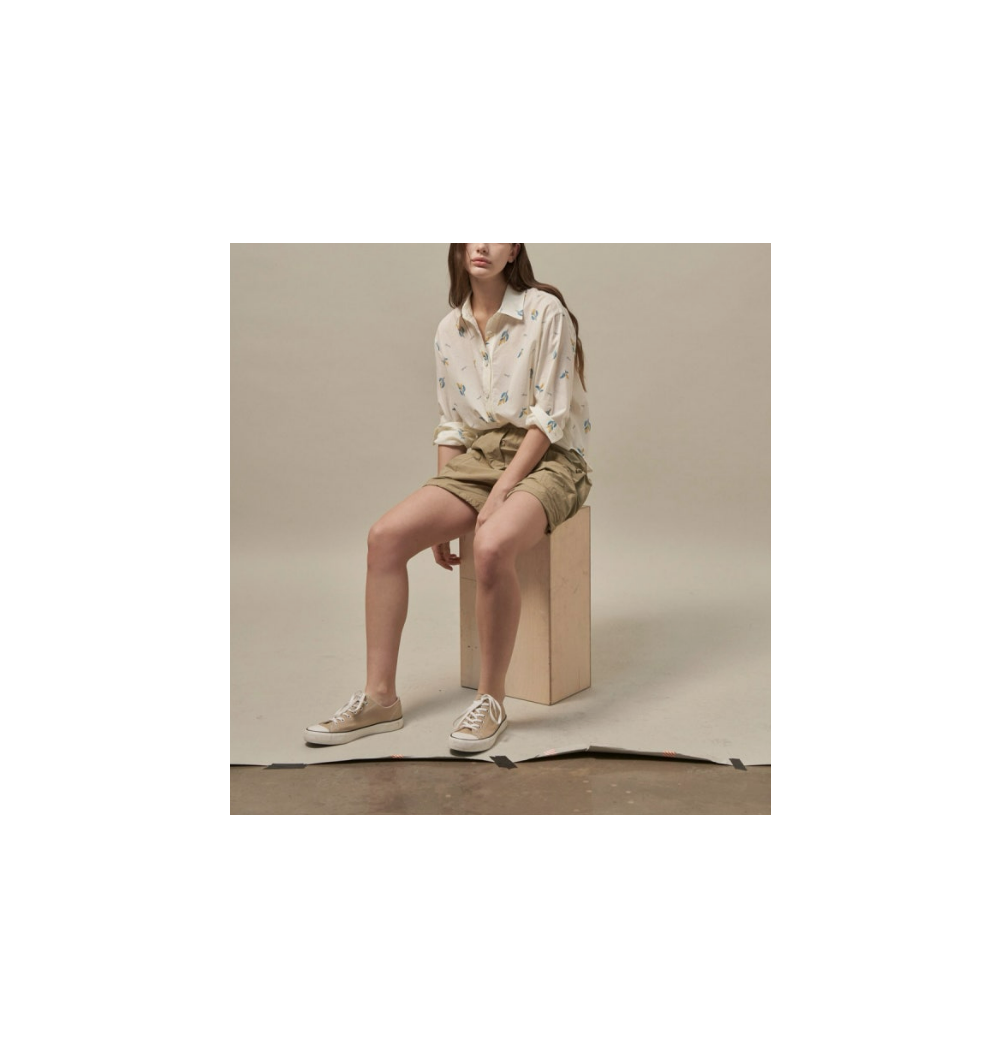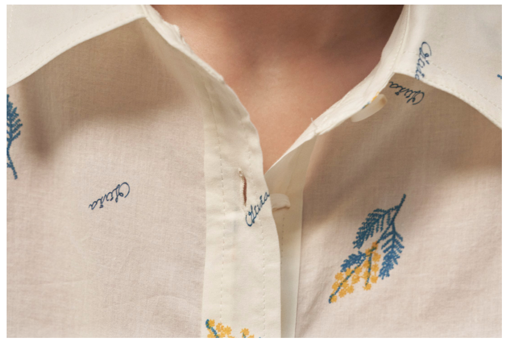 플라워 프린트와 로고 프린트가 믹스된 소재감으로 포인트를 준 셔츠형 블라우스 입니다