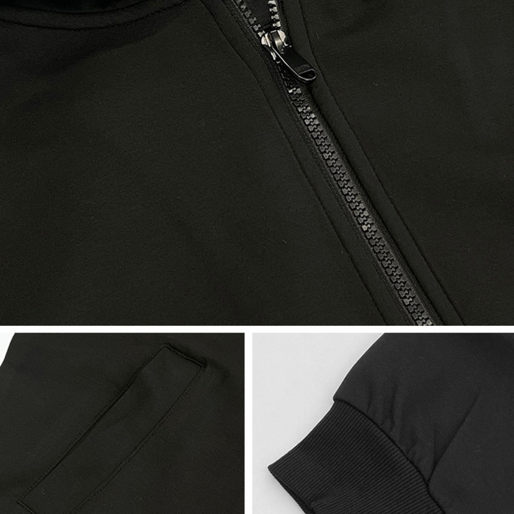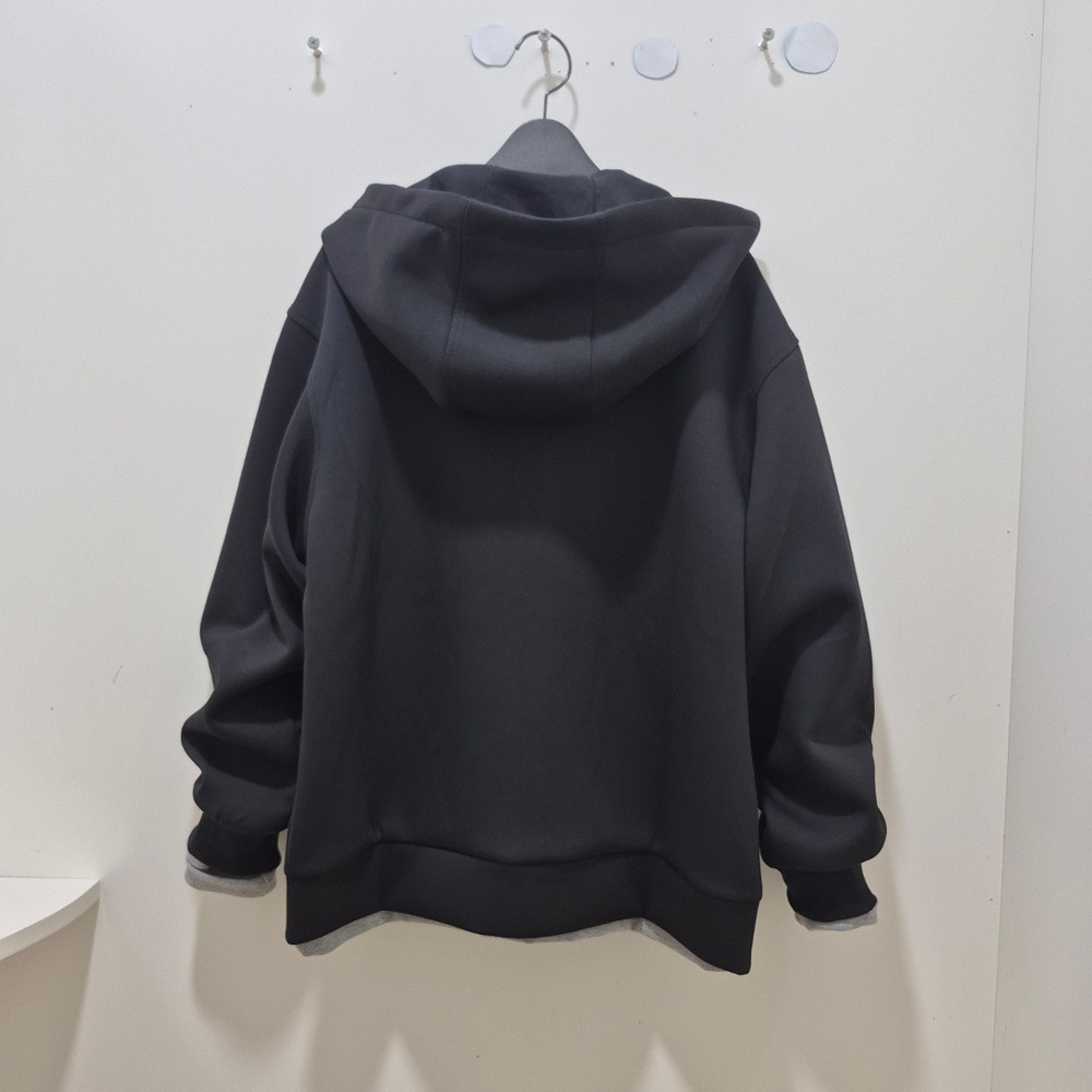 탄탄한 네오테리 원단과 소매 립단으로 형태를 잡아주며 아주 심플한 올 블랙의 얇지 않은 네오테리 원단의 후드집업