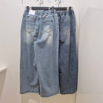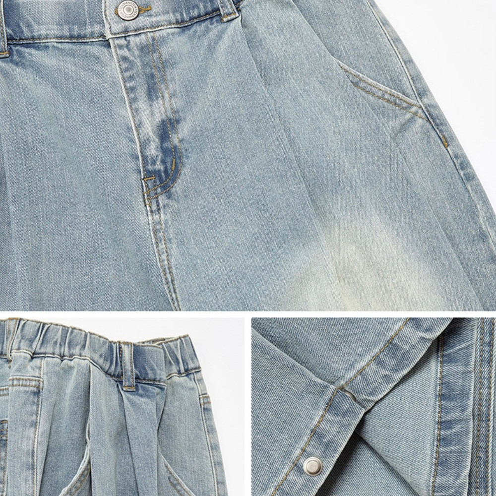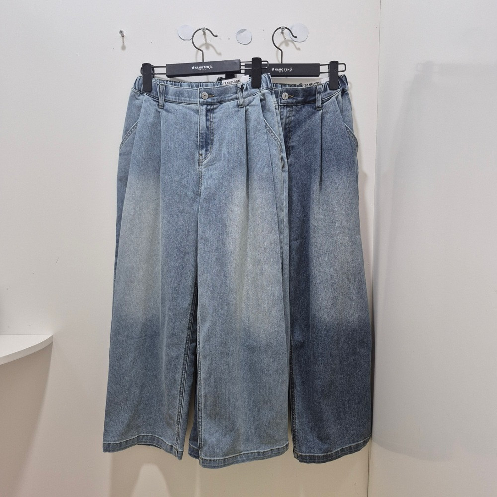 앞쪽 턱 주름으로 전체적으로 볼륨감있는 와이드핏으로 연출이 가능하며 밑단의 버튼으로 핏조절이 가능한 데님팬츠입니다